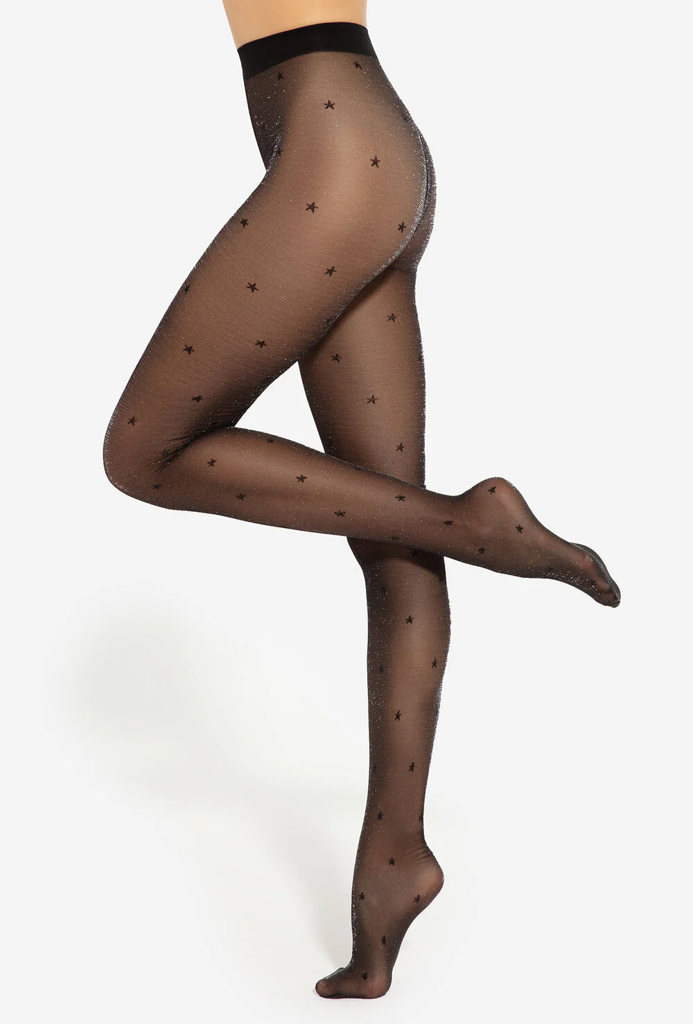 Die neue, glänzende Strumpfhose Gatta Silver Party 13 ist ein “Must-have” in dieser Saison mit ihrem schönen Sternenmuster. Spektakulär ist zudem das glänzendes Aussehen der Strumpfhose, ein perfektes Basic für Dein Outfit. Die Strumpfhosen der Silver Party Reihe mit ihren unterschiedlichen Designs, sind die perfekte Ergänzung für Weihnachts-, Silvester- und Karnevals-Styles.