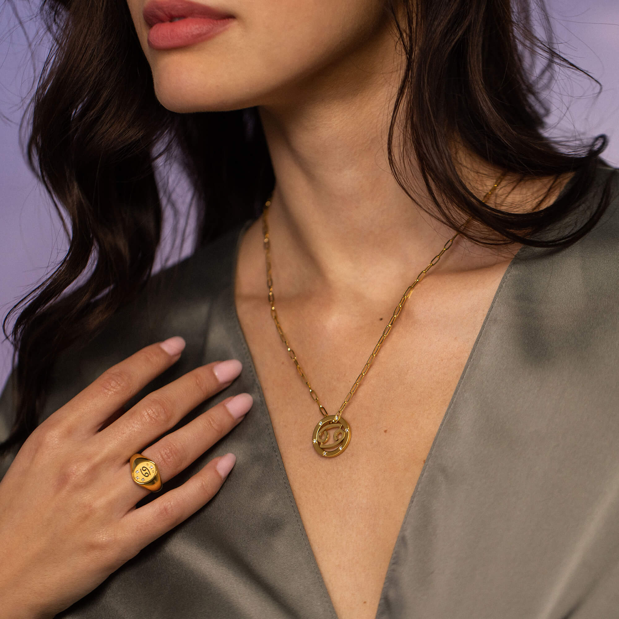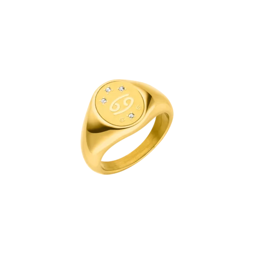 Auf der ovalen Oberfläche der Zodiac Siegelrings sind vier Schmucksteine um das geprägte Symbol für das Sternzeichen Krebs angeordnet.