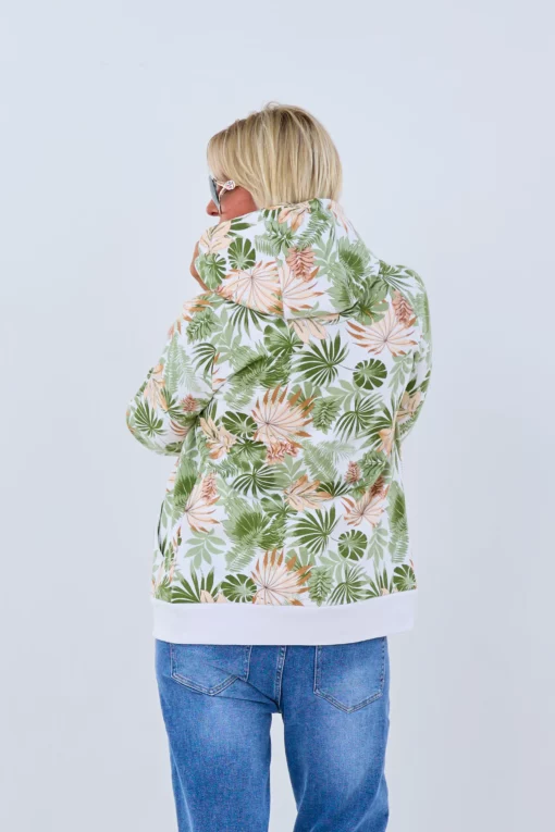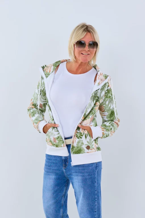Tolle Hoodie Jacke mit Palmenmuster. Die Jacke hat einen Reißverschluss, zwei Eingriffstaschen, Bündchen an den Ärmeln und unten und Kordelzug an der Kapuze. Die Jacke ist gerade geschnitten und von innen angeraut.